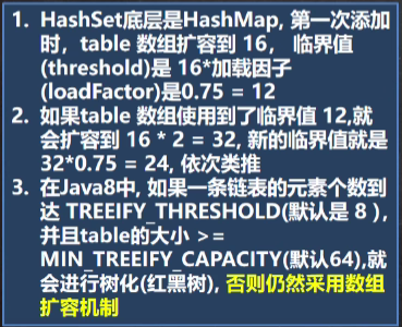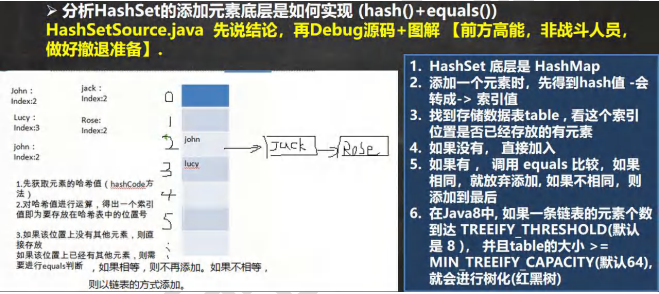 HashSet hashSet = new HashSet(); hashSet.add("java");//到此位置,第 1 次 add 分析完毕. hashSet.add("php");//到此位置,第 2 次 add 分析完毕 hashSet.add("java"); System.out.println("set=" + hashSet); /* 老韩对 HashSet 的源码解读 1. 执行 HashSet() public HashSet() { map = new HashMap<>(); } 2. 执行 add() public boolean add(E e) {//e = "java" return map.put(e, PRESENT)==null;//(static) PRESENT = new Object(); } 3.执行 put() , 该方法会执行 hash(key) 得到 key 对应的 hash 值 算法 h = key.hashCode()) ^ (h >>> 16) public V put(K key, V value) {//key = "java" value = PRESENT 共享 return putVal(hash(key), key, value, false, true); } 4.执行 putVal final V putVal(int hash, K key, V value, boolean onlyIfAbsent, boolean evict) { Node<K,V>[] tab; Node<K,V> p; int n, i; //定义了辅助变量 //table 就是 HashMap 的一个数组,类型是 Node[] //if 语句表示如果当前 table 是 null, 或者 大小=0 //就是第一次扩容,到 16 个空间. if ((tab = table) == null || (n = tab.length) == 0) n = (tab = resize()).length; //(1)根据 key,得到 hash 去计算该 key 应该存放到 table 表的哪个索引位置 //并把这个位置的对象,赋给 p //(2)判断 p 是否为 null //(2.1) 如果 p 为 null, 表示还没有存放元素, 就创建一个 Node (key="java",value=PRESENT) //(2.2) 就放在该位置 tab[i] = newNode(hash, key, value, null) if ((p = tab[i = (n - 1) & hash]) == null) tab[i] = newNode(hash, key, value, null); else { //一个开发技巧提示: 在需要局部变量(辅助变量)时候,在创建 Node<K,V> e; K k; // //如果当前索引位置对应的链表的第一个元素和准备添加的 key 的 hash 值一样 //并且满足 下面两个条件之一: //(1) 准备加入的 key 和 p 指向的 Node 结点的 key 是同一个对象 //(2) p 指向的 Node 结点的 key 的 equals() 和准备加入的 key 比较后相同 //就不能加入 if (p.hash == hash && ((k = p.key) == key || (key != null && key.equals(k)))) e = p; //再判断 p 是不是一颗红黑树, //如果是一颗红黑树,就调用 putTreeVal , 来进行添加 else if (p instanceof TreeNode) e = ((TreeNode<K,V>)p).putTreeVal(this, tab, hash, key, value); else {//如果 table 对应索引位置,已经是一个链表, 就使用 for 循环比较 //(1) 依次和该链表的每一个元素比较后,都不相同, 则加入到该链表的最后 // 注意在把元素添加到链表后,立即判断 该链表是否已经达到8 个结点 // , 就调用 treeifyBin() 对当前这个链表进行树化(转成红黑树) // 注意,在转成红黑树时,要进行判断, 判断条件 // if (tab == null || (n = tab.length) < MIN_TREEIFY_CAPACITY(64)) // resize(); // 如果上面条件成立,先 table 扩容. // 只有上面条件不成立时,才进行转成红黑树 //(2) 依次和该链表的每一个元素比较过程中,如果有相同情况,就直接break for (int binCount = 0; ; ++binCount) { if ((e = p.next) == null) { p.next = newNode(hash, key, value, null); if (binCount >= TREEIFY_THRESHOLD(8) - 1) // -1 for 1st treeifyBin(tab, hash); break; } if (e.hash == hash && ((k = e.key) == key || (key != null && key.equals(k)))) break; p = e; } } if (e != null) { // existing mapping for key V oldValue = e.value; if (!onlyIfAbsent || oldValue == null) e.value = value; afterNodeAccess(e); return oldValue; } } ++modCount; //size 就是我们每加入一个结点 Node(k,v,h,next), size++ if (++size > threshold) resize();//扩容 afterNodeInsertion(evict); return null; } */