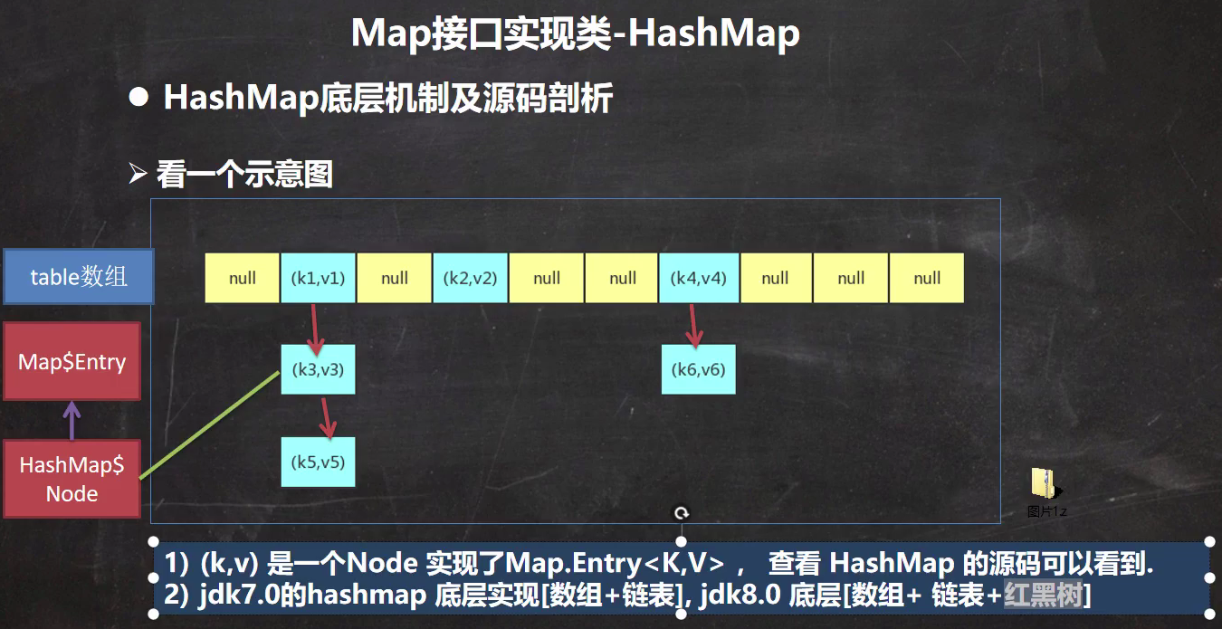 Map map = new HashMap(); map.put("邓超", "孙俪"); map.put("王宝强", "马蓉"); map.put("宋喆", "马蓉"); map.put("刘令博", null); map.put(null, "刘亦菲"); map.put("鹿晗", "关晓彤"); //第一组: 先取出 所有的 Key , 通过 Key 取出对应的 Value Set keyset = map.keySet(); //(1) 增强 for System.out.println("-----第一种方式-------"); for (Object key : keyset) { System.out.println(key + "-" + map.get(key)); } //(2) 迭代器 System.out.println("----第二种方式--------"); Iterator iterator = keyset.iterator(); while (iterator.hasNext()) { Object key = iterator.next(); System.out.println(key + "-" + map.get(key)); } //第二组: 把所有的 values 取出 Collection values = map.values(); //这里可以使用所有的 Collections 使用的遍历方法 //(1) 增强 for System.out.println("---取出所有的 value 增强 for----"); for (Object value : values) { System.out.println(value); } //(2) 迭代器 System.out.println("---取出所有的 value 迭代器----"); Iterator iterator2 = values.iterator(); while (iterator2.hasNext()) { Object value = iterator2.next(); System.out.println(value); } //第三组: 通过 EntrySet 来获取 k-v Set entrySet = map.entrySet();// EntrySet<Map.Entry<K,V>> //(1) 增强 for System.out.println("----使用 EntrySet 的 for 增强(第 3 种)----"); for (Object entry : entrySet) { //将 entry 转成 Map.Entry Map.Entry m = (Map.Entry) entry; System.out.println(m.getKey() + "-" + m.getValue()); } //(2) 迭代器 System.out.println("----使用 EntrySet 的 迭代器(第 4 种)----"); Iterator iterator3 = entrySet.iterator(); while (iterator3.hasNext()) { Object entry = iterator3.next(); //System.out.println(next.getClass());//HashMap$Node -实现-> Map.Entry (getKey,getValue) //向下转型 Map.Entry Map.Entry m = (Map.Entry) entry; System.out.println(m.getKey() + "-" + m.getValue()); }