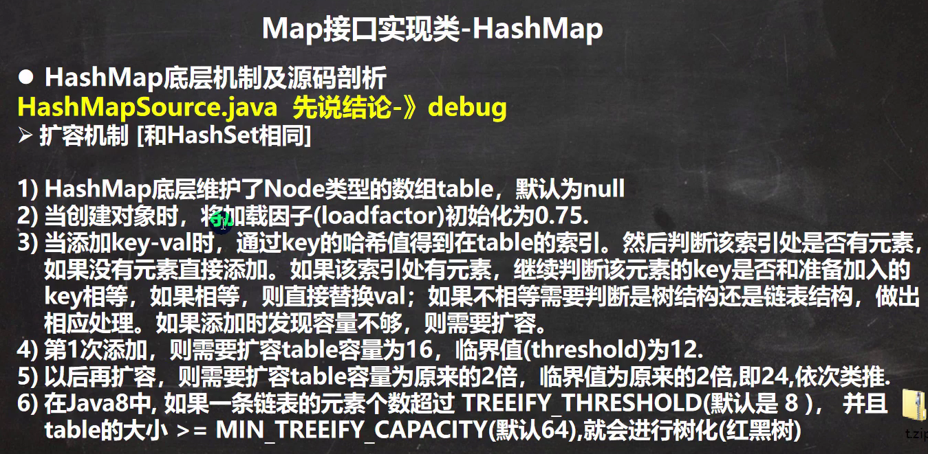 HashMap map = new HashMap(); map.put("java", 10);//ok map.put("php", 10);//ok map.put("java", 20);//替换 value System.out.println("map=" + map);// /*老韩解读 HashMap 的源码+图解 1. 执行构造器 new HashMap() 初始化加载因子 loadfactor = 0.75 HashMap$Node[] table = null 2. 执行 put 调用 hash 方法,计算 key 的 hash 值 (h = key.hashCode()) ^ (h >>> 16) public V put(K key, V value) {//K = "java" value = 10 return putVal(hash(key), key, value, false, true); } 3. 执行 putVal final V putVal(int hash, K key, V value, boolean onlyIfAbsent, boolean evict) { Node<K,V>[] tab; Node<K,V> p; int n, i;//辅助变量 //如果底层的 table 数组为 null, 或者 length =0 , 就扩容到 16 if ((tab = table) == null || (n = tab.length) == 0) n = (tab = resize()).length; //取出 hash 值对应的 table 的索引位置的 Node, 如果为 null, 就直接把加入的k-v //, 创建成一个 Node ,加入该位置即可 if ((p = tab[i = (n - 1) & hash]) == null) tab[i] = newNode(hash, key, value, null); else { Node<K,V> e; K k;//辅助变量 // 如果 table 的索引位置的 key 的 hash 相同和新的 key 的 hash 值相同, // 并 满足(table 现有的结点的 key 和准备添加的 key 是同一个对象 || equals 返回真) // 就认为不能加入新的 k-v if (p.hash == hash && ((k = p.key) == key || (key != null && key.equals(k)))) e = p; else if (p instanceof TreeNode) //如果当前的 table 的已有的 Node 是红黑树,就按照红黑树的方式处理 e = ((TreeNode<K,V>)p).putTreeVal(this, tab, hash, key, value); else { //如果找到的结点,后面是链表,就循环比较 for (int binCount = 0; ; ++binCount) {//死循环 if ((e = p.next) == null) { //如果整个链表,没有和他相同,就加到该链表的最后p.next = newNode(hash, key, value, null); //加入后,判断当前链表的个数,是否已经到 8 个,到8 个,后 //就调用 treeifyBin 方法进行红黑树的转换 if (binCount >= TREEIFY_THRESHOLD - 1) // -1 for 1st treeifyBin(tab, hash); break; } if (e.hash == hash && //如果在循环比较过程中,发现有相同,就break,就只是替换 value((k = e.key) == key || (key != null && key.equals(k)))) break; p = e; } } if (e != null) { // existing mapping for key V oldValue = e.value; if (!onlyIfAbsent || oldValue == null) e.value = value; //替换,key 对应 value afterNodeAccess(e); return oldValue; } } ++modCount;//每增加一个 Node ,就 size++ if (++size > threshold[12-24-48])//如 size > 临界值,就扩容 resize(); afterNodeInsertion(evict); return null; } 5. 关于树化(转成红黑树) //如果 table 为 null ,或者大小还没有到 64,暂时不树化,而是进行扩容. //否则才会真正的树化 -> 剪枝 final void treeifyBin(Node<K,V>[] tab, int hash) { int n, index; Node<K,V> e; if (tab == null || (n = tab.length) < MIN_TREEIFY_CAPACITY) resize(); } */