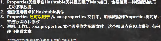 //老韩解读 //1. Properties 继承 Hashtable //2. 可以通过 k-v 存放数据,当然 key 和 value 不能为 null //增加 Properties properties = new Properties(); //properties.put(null, "abc");//抛出 空指针异常 //properties.put("abc", null); //抛出 空指针异常 properties.put("john", 100);//k-v properties.put("lucy", 100); properties.put("lic", 100); properties.put("lic", 88);//如果有相同的 key , value 被替换 System.out.println("properties=" + properties); //通过 k 获取对应值 System.out.println(properties.get("lic"));//88 //删除 properties.remove("lic"); System.out.println("properties=" + properties); //修改 properties.put("john", "约翰"); System.out.println("properties=" + properties);