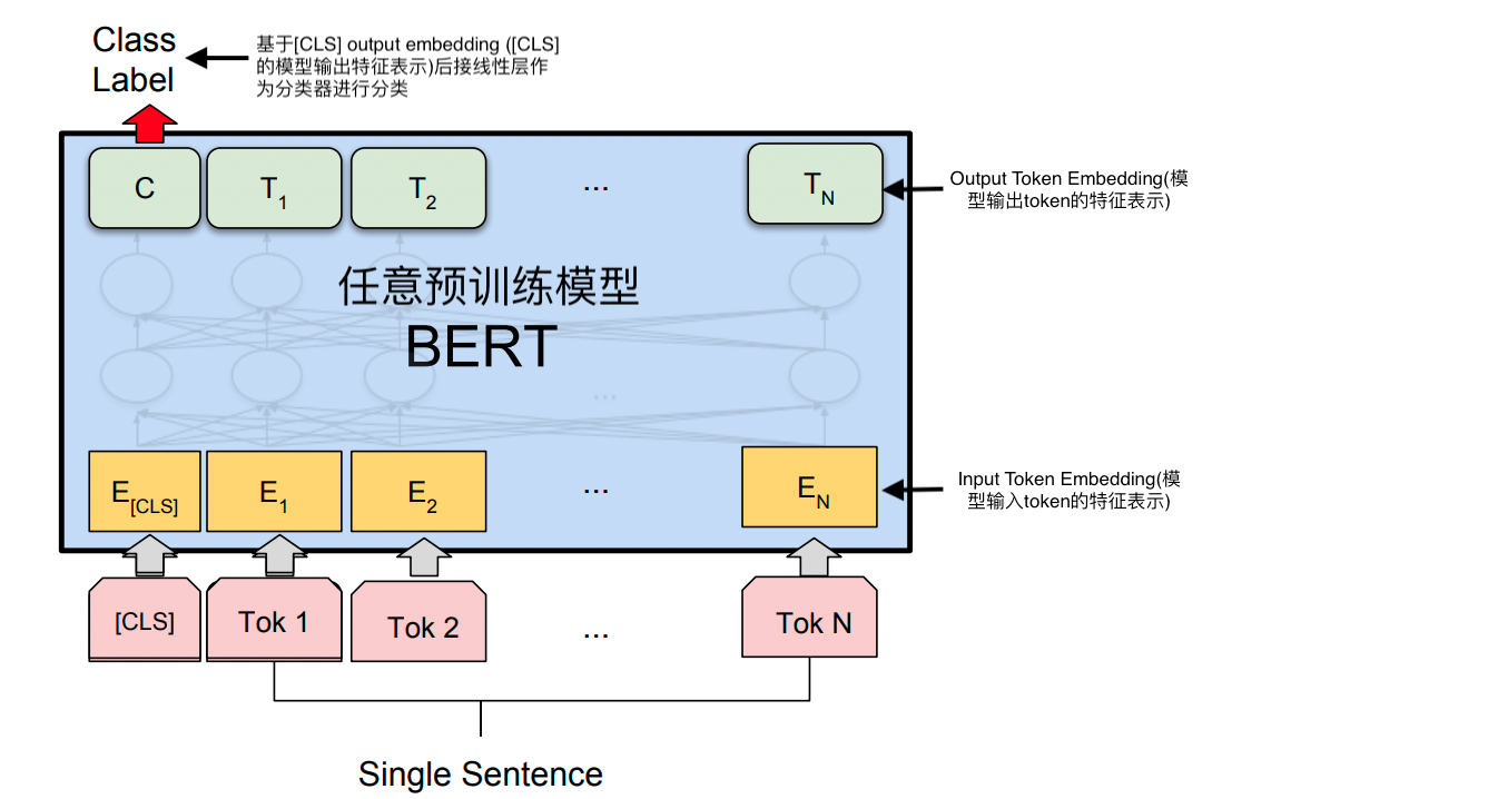 此外,模型会在每个输入的开头加入一个[CLS]的token,在句子对间加入一个[SEP]的token。如下图所示,每个输入token会映射为一个对应的特征表示,经过预训练模型得到每个token的输出特征表示,token输出的特征表示会用于不同的任务,[CLS]的输出特征通常被认为是整个句子的语义表示。