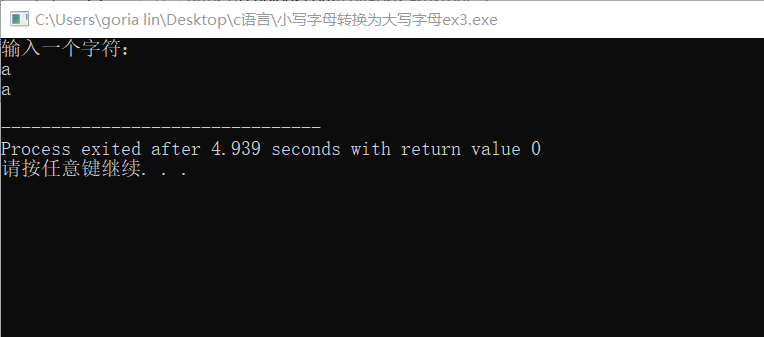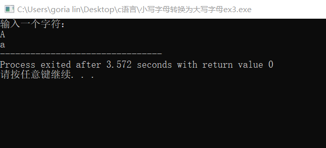 #include<stdio.h> int main(){ char ch; printf("输入一个字符: \n"); scanf("%c",&ch); if(ch>='a'&&ch<='z') printf("%c\n",ch); else ch==ch+32; printf("%c",ch+32); return 0; }