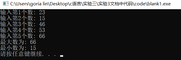 /* 编程找出5个整数的最大数和最小数 《C语言程序设计教程学习指导》p122实验内容(3) */ #include <stdio.h> #include <stdlib.h> int main() { int number, max, min, n; n=1; printf("输入第%d个数: ", n); scanf("%d", &number); max = number; min = number; while(n<5) { n++; printf("输入第%d个数: ", n); scanf("%d", &number); if(number>max) max = number; else if(number<min) min = number; } printf("最大数为: %d\n", max); printf("最小数为: %d\n", min); system("pause"); return 0; }