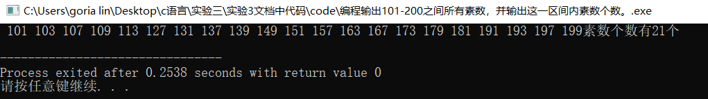 //编程输出101-200之间所有素数,并输出这一区间内素数个数。 #include<stdio.h> #include<math.h> int isprime(int m); int main(){ int i,n=0; for(i=101;i<=200;i++) { if(isprime(i)){ printf("%4d",i); n++; } } printf("素数个数有%d个\n",n); return 0; } int isprime(int m) { int k; for (k=2;k<=sqrt(m);k++) if(m%k==0) return 0; return 1; }