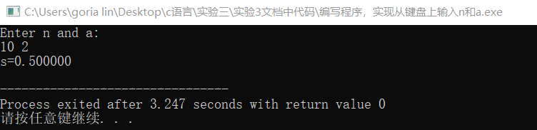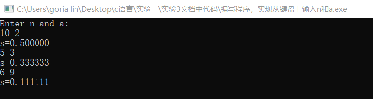 //编写程序,实现从键盘上输入n和a,根据公式s=1/a+2/aa+3/aaa+…+n/(a..a)计算s的值,并输出。 #include<stdio.h> #include<math.h> int main() { int n,a,i,b; double s,c; printf("Enter n and a:\n"); scanf("%d%d",&n,&a); b=a; s=1.0/a; for(i=2;i<n;i++) { b=b+a*pow(10,i-1); c=i/b; s=s+c; } printf("s=%f\n",s); return 0; }