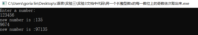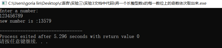 //将一个长整型数s的每一数位上的奇数依次取出来,构成一个新的数,起高位仍在高位,低位仍在低位 #include<stdio.h> #include <stdlib.h> int main() { printf("Enter a number:\n"); long int s,y; int a,b,d,x,s0; a=0,b=1; d=1,x=0,y=0; while (scanf("%ld",&s)){ s0=s; while(s0!=0) { s0=s0/10; a++; } for(b=1;b<=a;b++) { x=s%10; s=s/10; if(x%2==1) { y=y+x*d; d=d*10; } else y=y+0; } printf("new number is :%d\n",y); } return 0; system("pause"); }