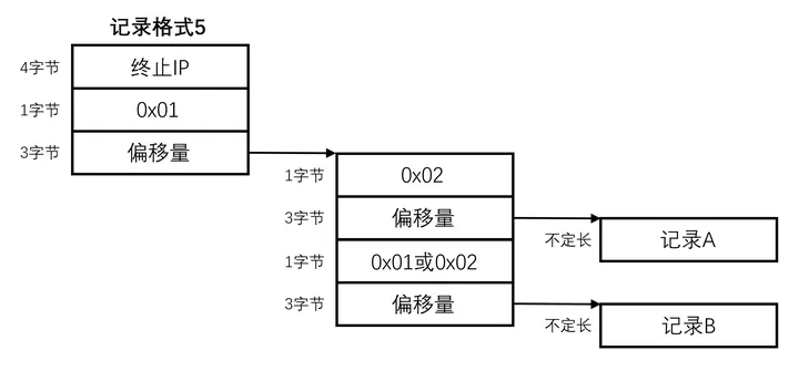 索引中偏移量指向位置的前4字节为终止IP的数据,下方数据部分存放着记录A与记录B两段信息,由于不同IP段之间记录内容存在大量重合,因此文件使用了重定向机制以节省空间,可分为5种存储方式。