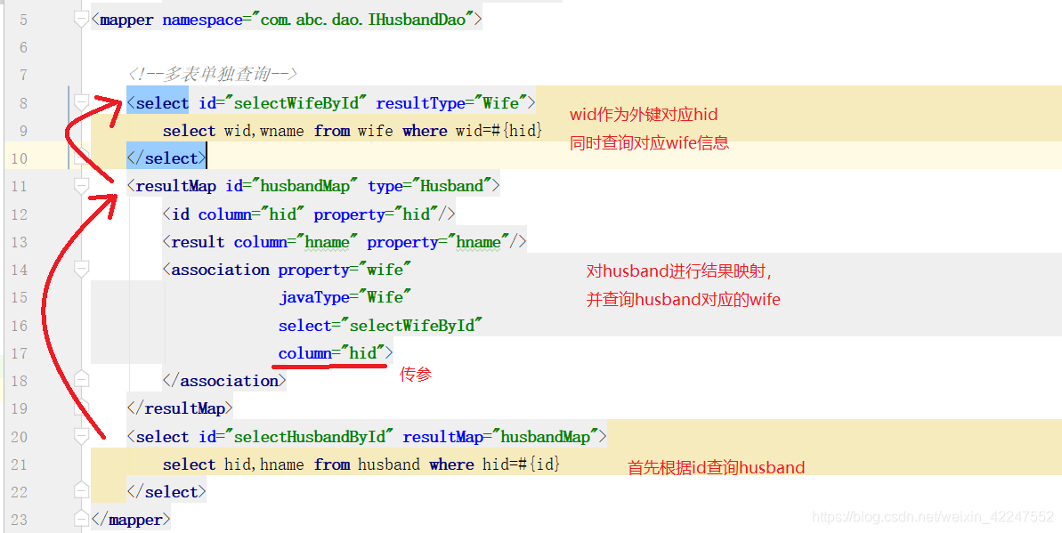 在实体类husband中关联wife,进行连接查询之后,需要使用resultMap对查出来的结果进行结果映射;