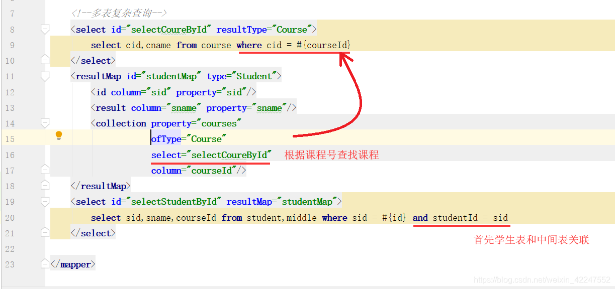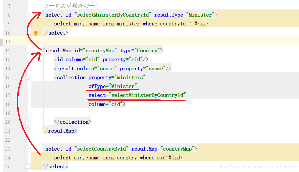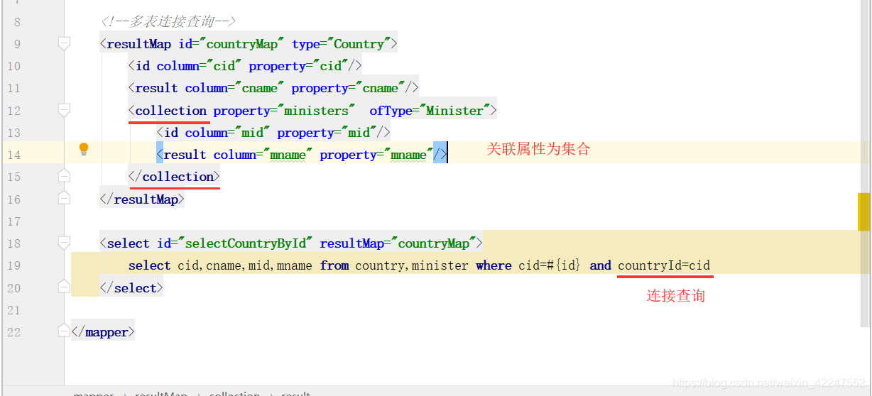 通过resultMap进行结果映射,collection标签可以指定映射的集合,其中porperty属性指定的是该关联属性的名称,ofType指定的是集合里面的java类型,id,result标签同resultMap中的一样是对集合里面的属性进行映射;