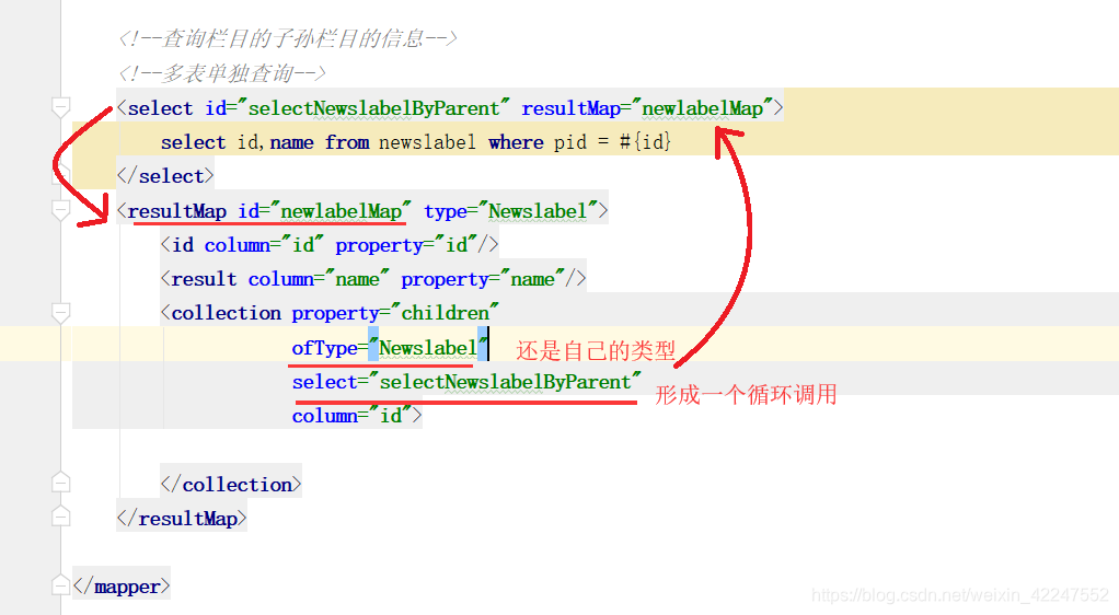 在resultMap中collection的select中调用原来的查询语句进行查询,形成一个循环调用,一直到查询到的子栏目为空的时候停止;最后对查询结果进行映射。
