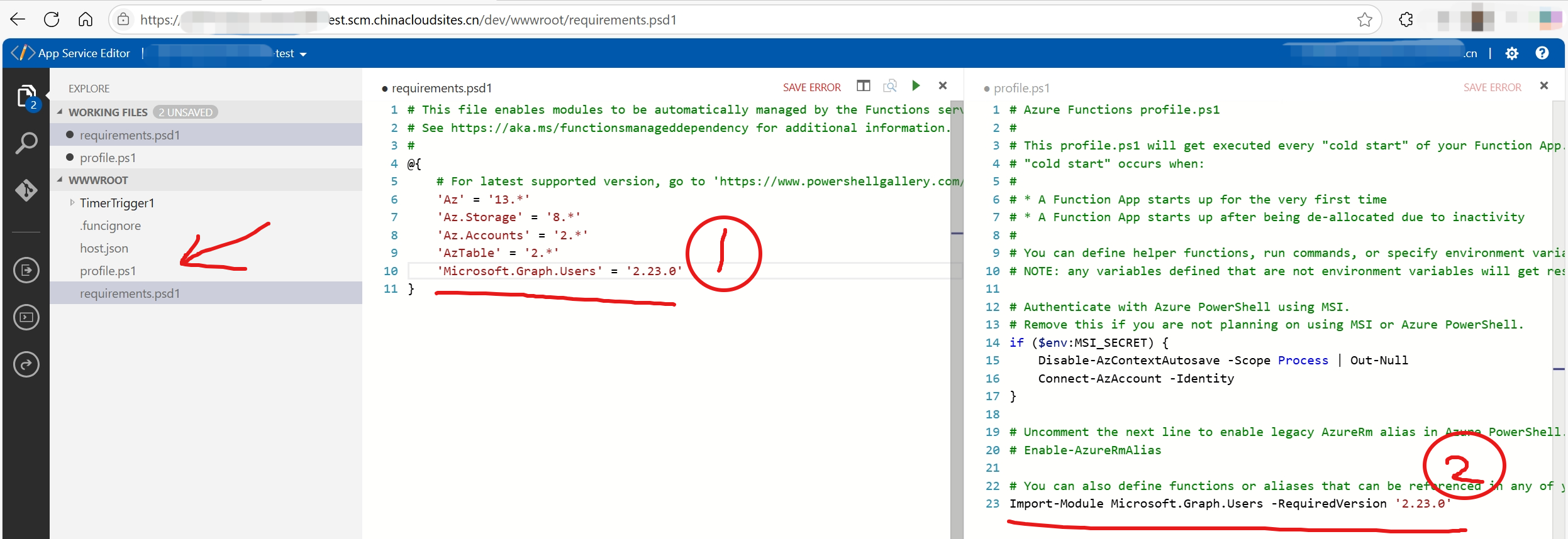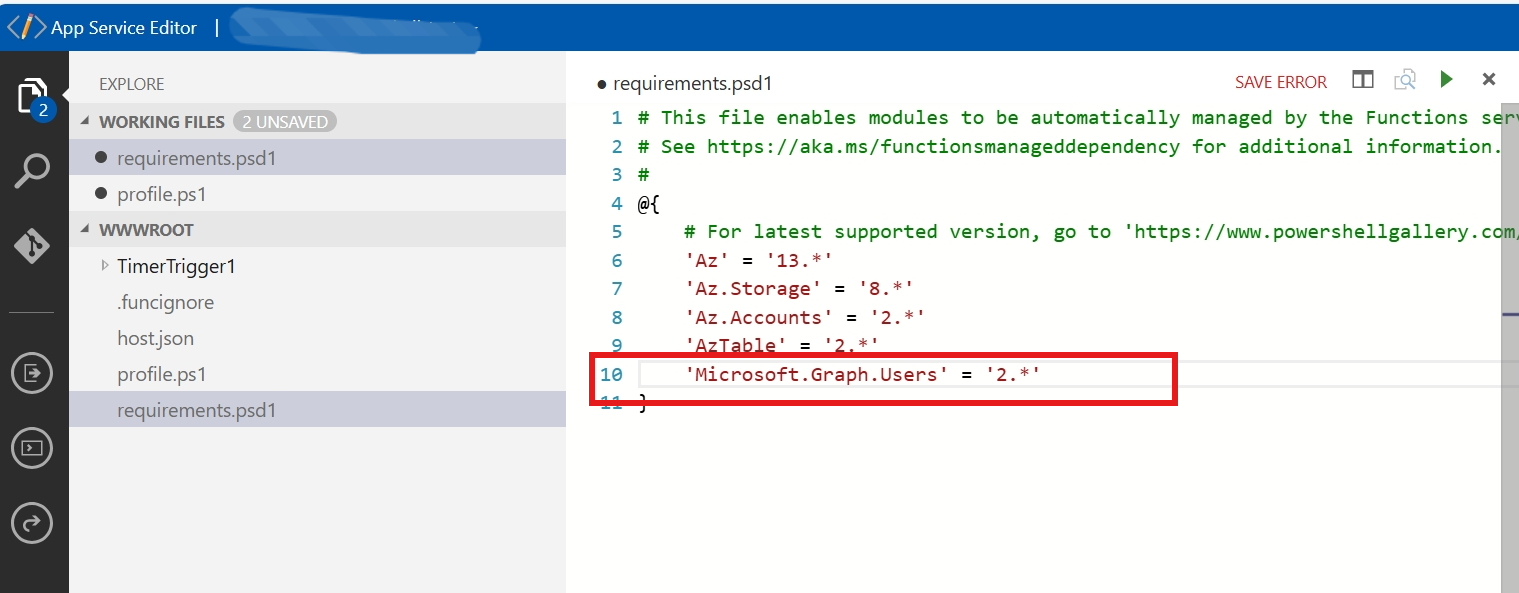 在Function App上执行PowerShell Function,使用Requirements.psd1文件来管理PowerShell的module。当前设定的配置例如 “'Microsoft.Graph.Users' = '2.*'”。