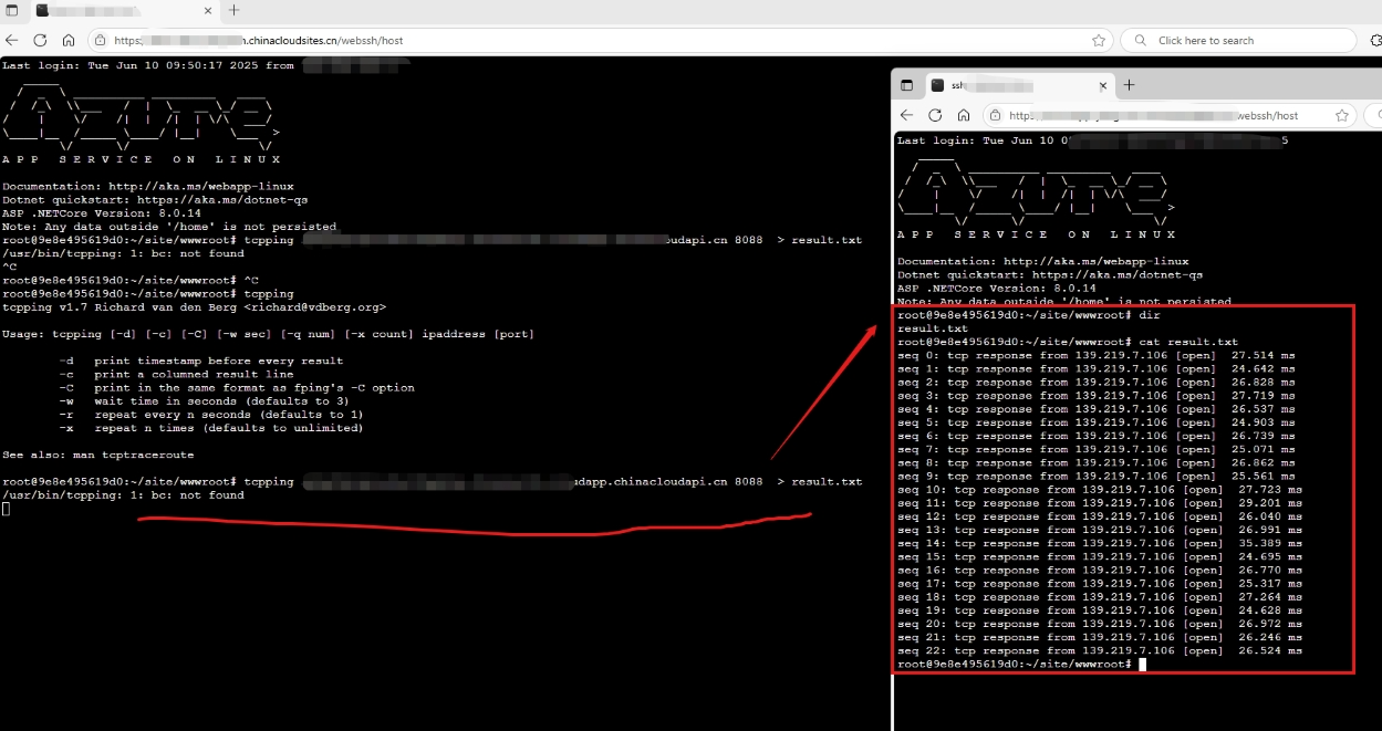 本文以App Service为例,使用它自带的 tcpping 工具,把ping的结果输出到文本文件,用于辅助判断在长ping的时间段中,是否有timeout的情况发生。