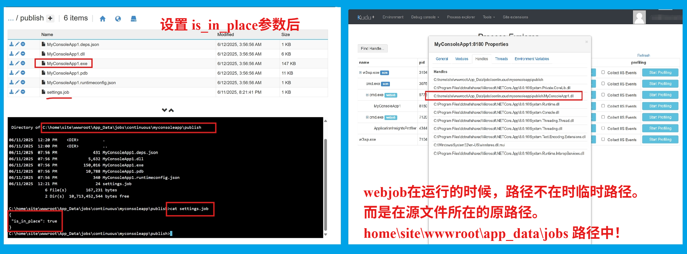 1) is_in_place 参数值默认为false的情况下,webjob的源文件在 C:\home\site\wwwroot\App_Data\jobs\continuous\myconsoleapp\publish\MyConsoleApp1.dll, 而运行目录为:D:\DWASFiles\Sites\#1xxxxxxx