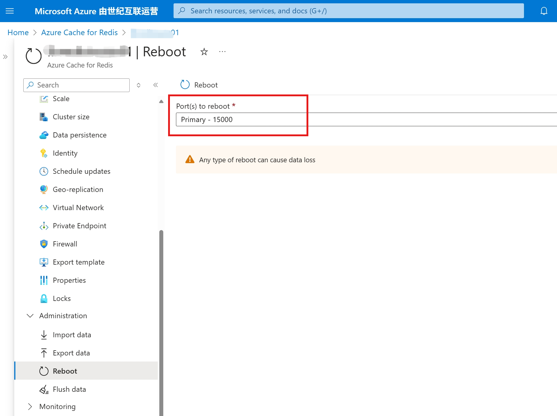 通过Azure Cache for Redis的Azure门户,进入Reboot“重启节点”。注意,只有重启Primary才能模拟故障转移(Failover)场景。