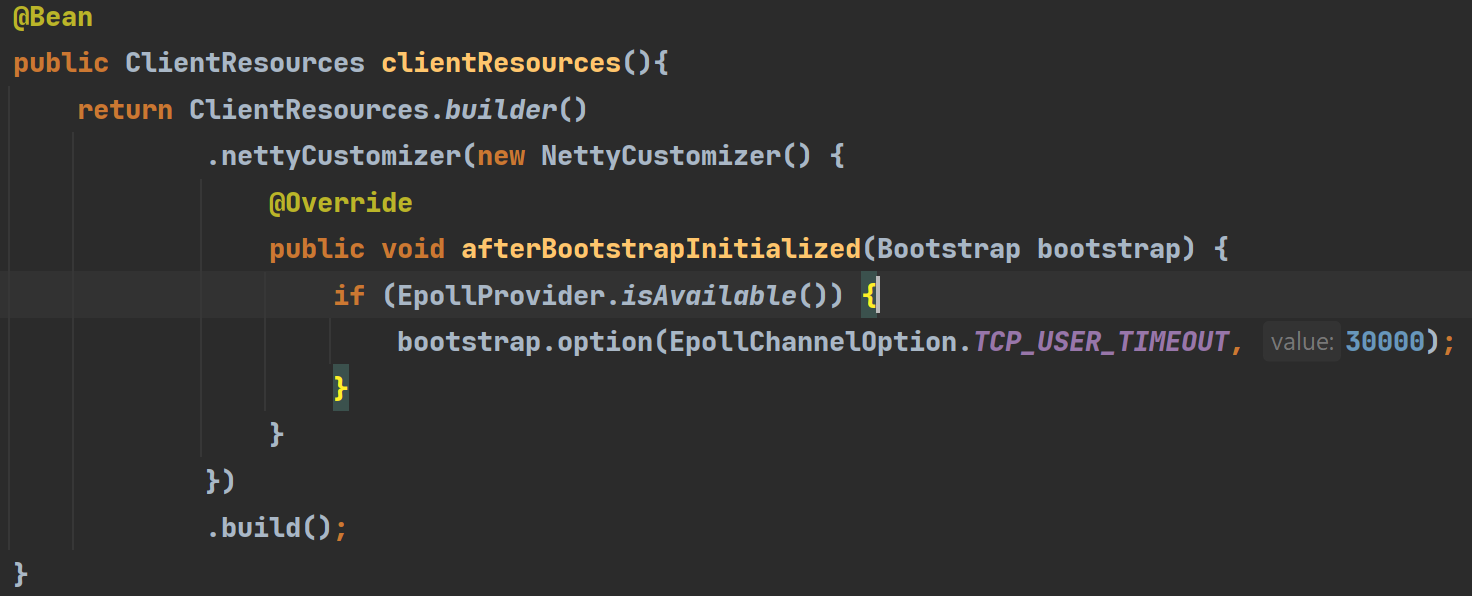 3、Lettuce SDK的开源社区中也提到了一种修改TCP_USER_TIMEOUT的方式以缓解该问题,对于直接使用Lettuce SDK的方式可以参考: