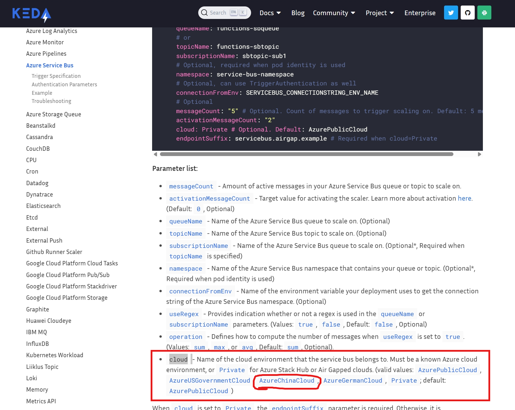 这是 KEDA(Kubernetes-based Event Driven Autoscaling)在中国 Azure 环境下的必要配置。