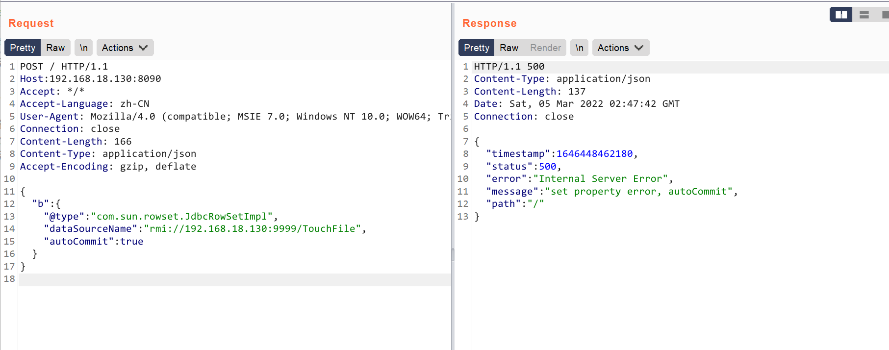 1.报错回显:构造不完整的json数据,比如缺个括号,查看返回包,发现有fastjson字样,我测试发下没有不确定哪里有问题,状态码500,所以试一下dnslog回显。