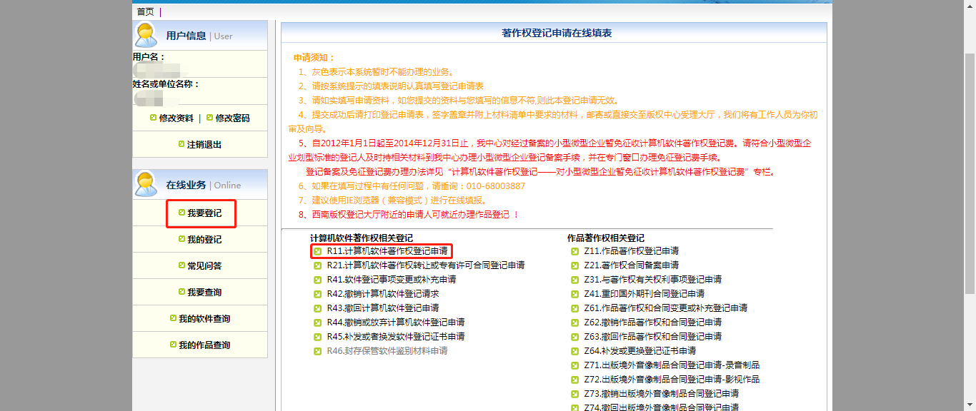 位置:进入官网后(未注册用户需要注册一下)-->软件登记-->我要登记-->R11计算机软件著作权登记申请