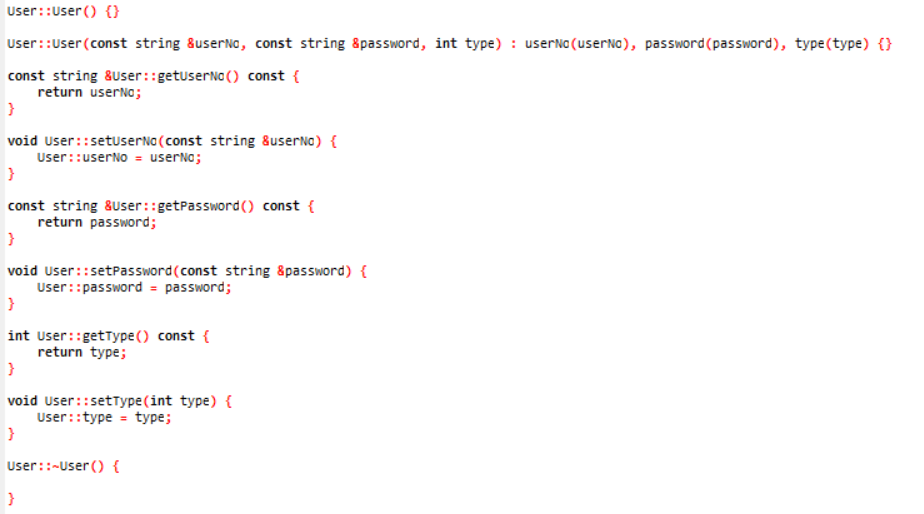 工程文件的User类在User.h和User.cpp中分别实现类的定义和实现,设计到的功能函数和变量定义如下: