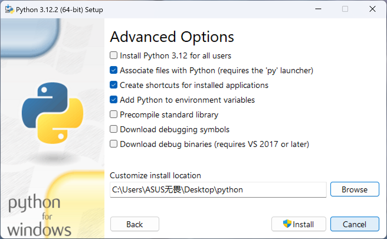 和Add python.exe to PATH(PATH是Python的环境变量,Python在安装时会自动配置环境变量)