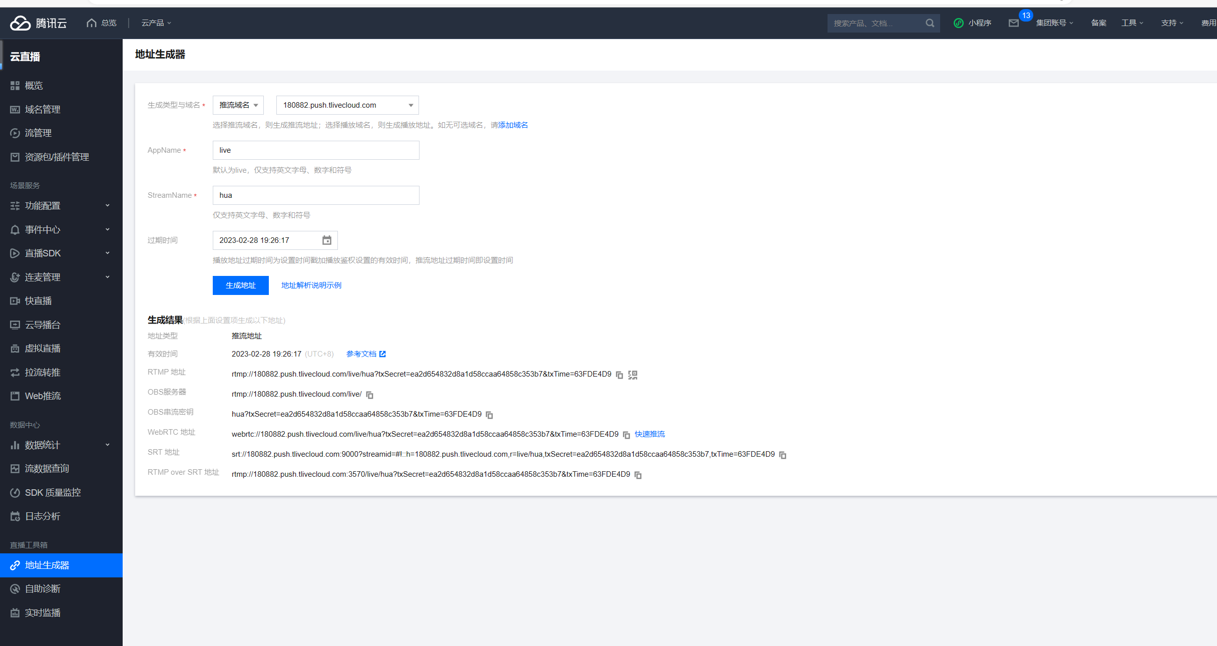 三、腾讯云直播平台生成推流地址以及拉流地址