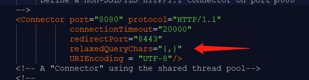 在tomcat conf路径下的server.xml文件里面的 Connector 标签下添加属性 relaxedQueryChars: