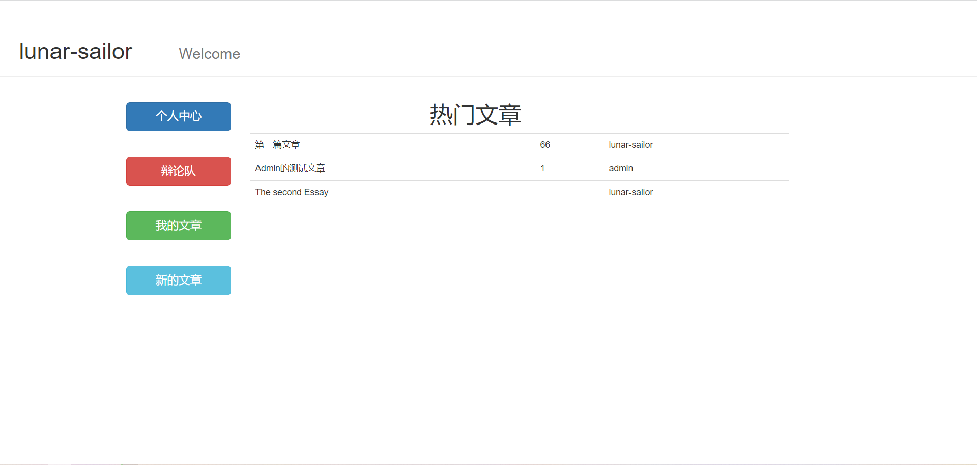 项目是一个面向辩手的管理信息系统,基础的登录,写文章、发表文章、阅读文章、点赞都有了;但是目前也还有很多欠缺的功能,像用户是没有头像的,也没有用户主页做管理操作、没有登出操作、点赞功能也有bug,(具体后面说)、还有像文章的话,合理应该有一个草稿状态,然后发表文章前有个审核环节、有个发表但待审核状态、这些都没实现,而且对于这些部分的数据库应该怎么设计;还有挺多问题的,慢慢来吧。