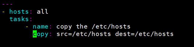 第二行定义改playbook剧本管理的目标主机,all表示针对所有的主机,这个位置定义支持Ansible Ad-Hoc模式的所有参数