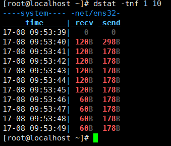 现在可用命令查看dstat -tnf 1 10 输出接下来10秒内每秒的网络数据: