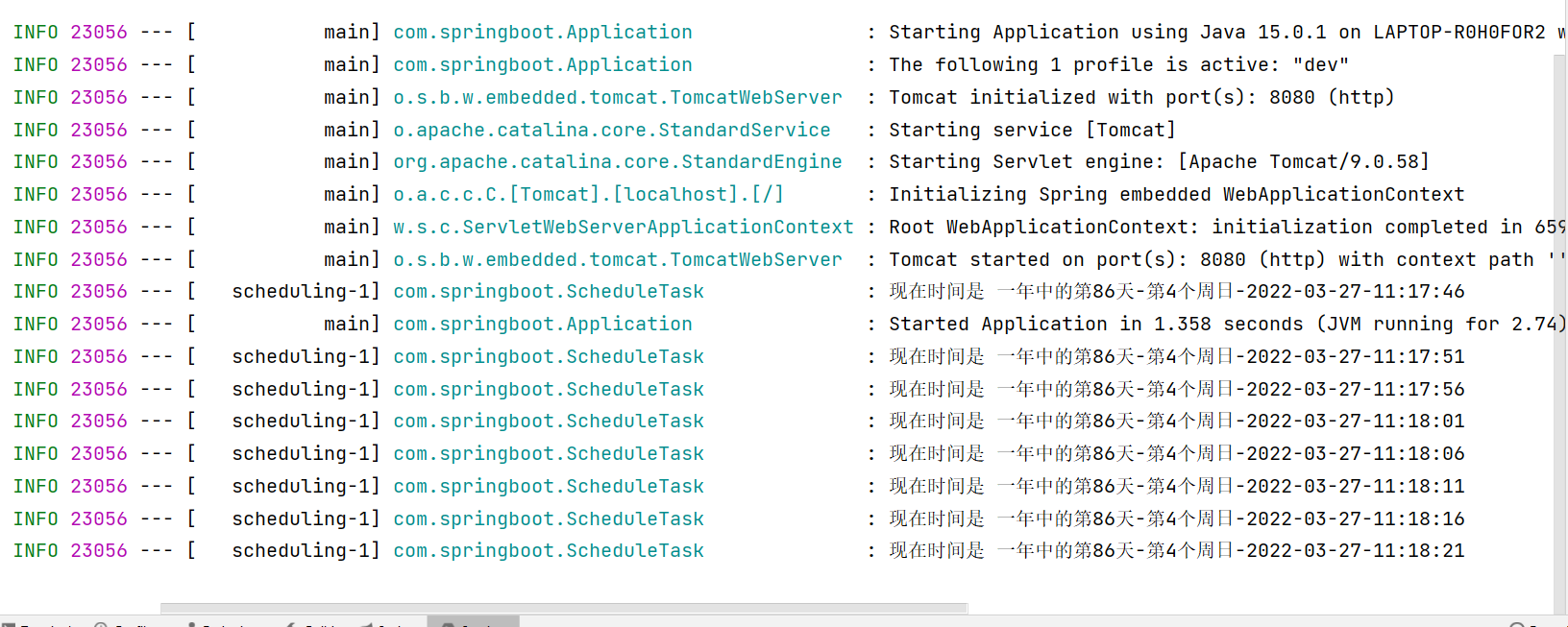 1 package com.springboot; 2 3 import org.slf4j.Logger; 4 import org.slf4j.LoggerFactory; 5 import org.springframework.scheduling.annotation.Scheduled; 6 import org.springframework.stereotype.Component; 7 8 import java.text.SimpleDateFormat; 9 import java.util.Date; 10 11 @Component 12 public class ScheduleTask { 13 14 public static final Logger logger = LoggerFactory.getLogger(ScheduleTask.class); 15 public static final SimpleDateFormat sdf = 16 new SimpleDateFormat("一年中的第D天-第F个E-yyyy-MM-dd-HH:mm:ss"); 17 18 //固定每5s刷新一次 19 @Scheduled(fixedRate = 5000L) 20 public void currentTime(){ 21 //{}:占位符 22 logger.info("现在时间是 {}",sdf.format(new Date())); 23 } 24 }