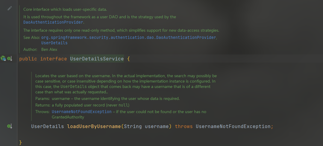 如果需要自定义逻辑时,只需要实现 UserDetailsService 接口即可。接口定义如下: