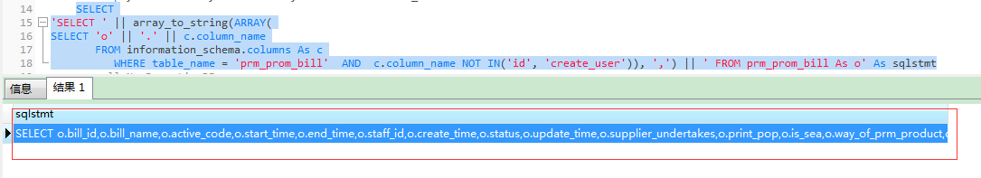 WHERE table_name = '表名'  AND  c.column_name NOT IN('排除字段', '排除字段')), ',') || ' FROM 表名 As o' As sqlstmt