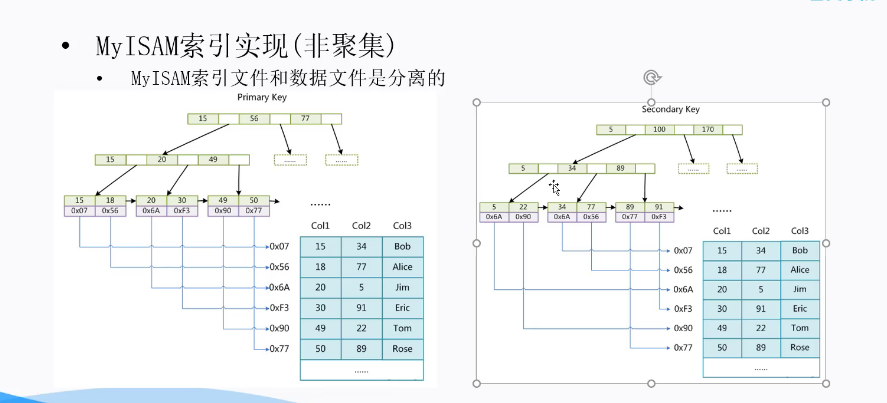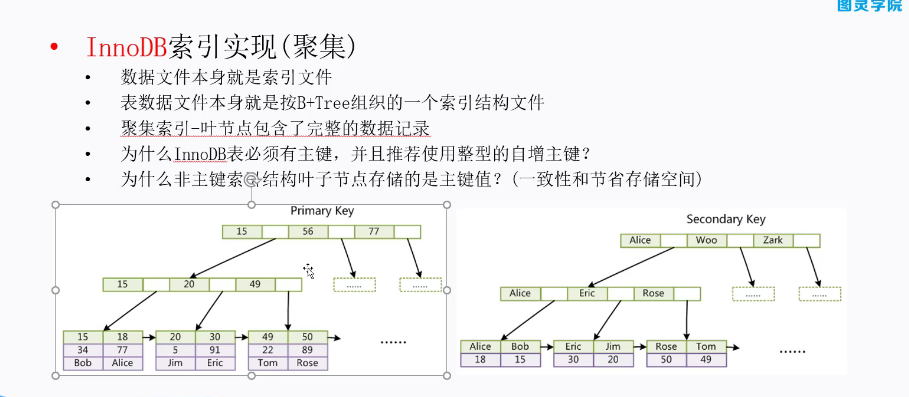 在数据的叶子节点中保存的是数据中的索引和当前的数据