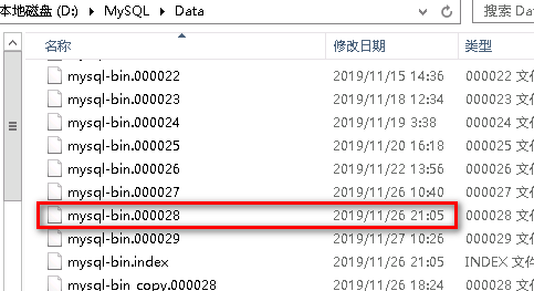 打开数据库所在路径查看有mysql-bin.****这样的文件,注意DELETE删除的时间,对比mysql-bin文件的修改时间,我的是26号下午18点左右进行的删除数据,所以找mysql-bin.000028这个文件