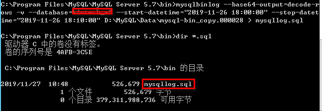 mysqlbinlog --base64-output=decode-rows -v --database=DBName --start-datetime="2019-11-26 18:00:00" --stop-datetime="2019-11-26 18:10:00" D:\MySQL\Data\mysql-bin_copy.000028 > mysqllog.sql