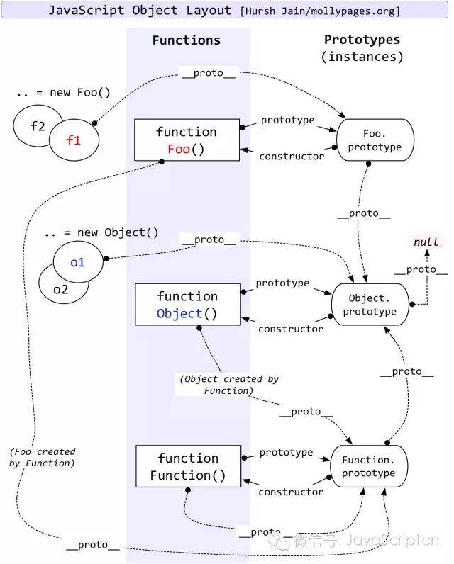 这是一张描述了Object、Function以及一个函数实例Foo他们之间原型之间联系。如果理解了上面的概念,这张图是不难读懂。