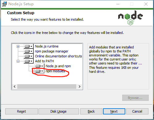 3、这一步是选择安装哪些模块,默认是全部安装,对于新手来说建议全部安装。点开那个add path选项前面的+号,我们看到,会主动把NodeJS和NPM这两个模块的命令路径添加到系统路径里,对于我们来说就非常方便了。点击next继续下一步,然后确认信息,点击Install开始安装,然后程序就开始复制文件等一系列步骤。一直到安装完毕。