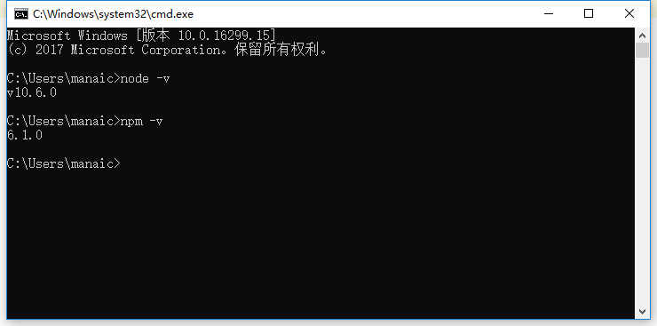 如果正确输出版本号,说明我们的NodeJS和NPM就安装好了,如下图所示: