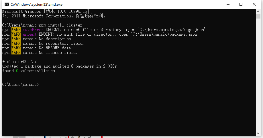 1、并不是说NodeJS和NPM安装好了以后就能直接使用了,这也是新手经常犯的一个错误之一。因为默认情况下,NPM安装的模块并不会安装到NodeJS的程序目录,比如上面安装的时候我们设置的D:\Program Files\nodejs\目录,我们用个示例来看一下,我们先用npm安装一个cluster模块,如下面第一张图所示,执行命令: