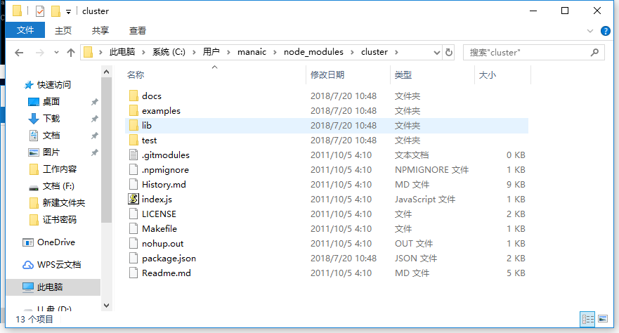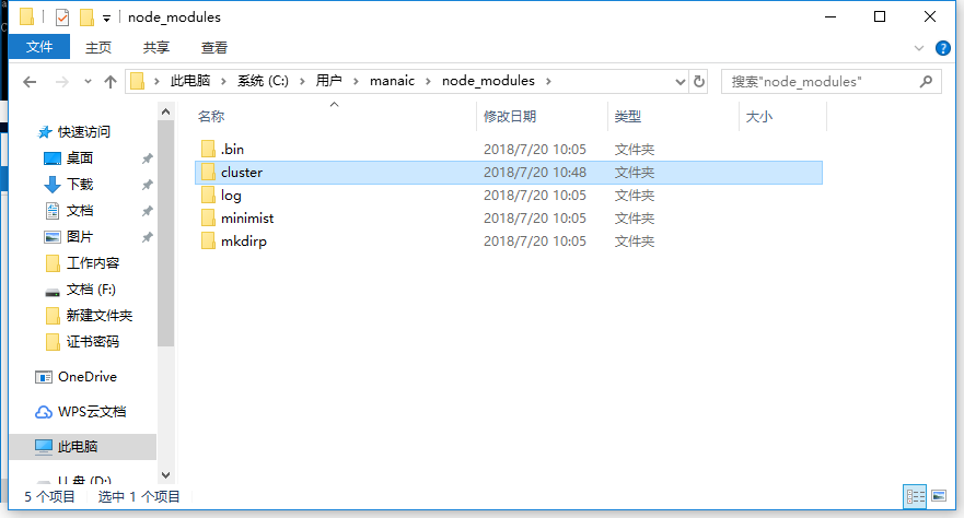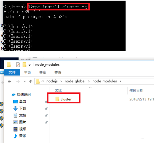 npm install cluster -g然后打开刚才创建的node_global目录,可以看到此时cluster目录就安装到这个目录底下了。
