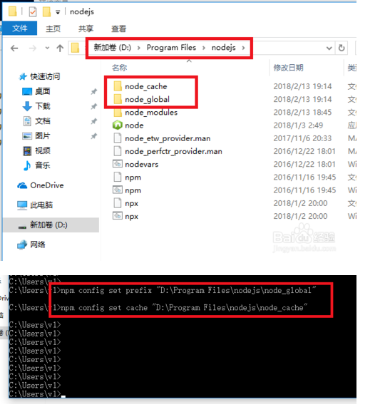 我们先来做第一步,在D盘nodejs目录下创建两个目录,分别是node_cache和node_global,这是用来放安装过程的缓存文件以及最终的模块配置位置。配置完成后,执行下面这两个命令: