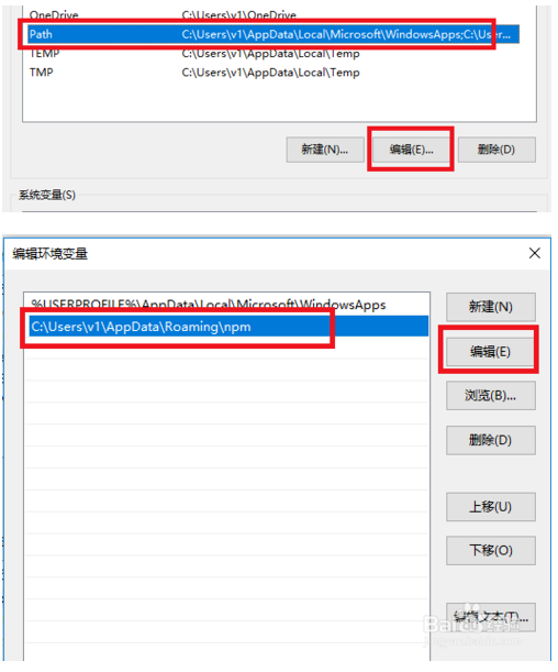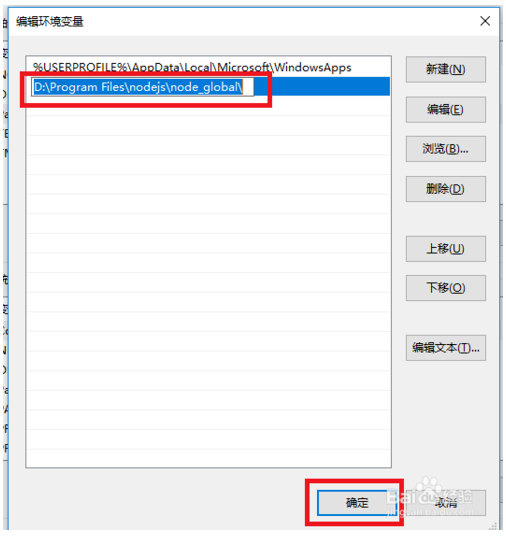 6、此时还需要修改一些nodejs默认的模块调用路径,因为模块的安装位置变了,如果nodejs的命令还到原来的位置去找,肯定是找不到安装的模块了。我们在环境变量窗口,选择Path,然后点击右下角的编辑,然后选择npm那个。点击右边的编辑,将其修改为:D:\Program Files\nodejs\node_global\然后点确定,保存这个配置。