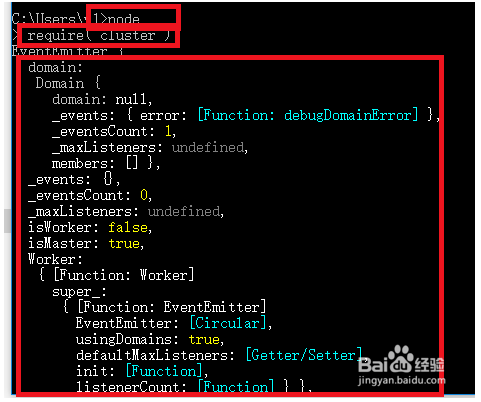 7、这个时候所有的配置工作才算完成了,然后打开一个新的cmd窗口。先输入命令:node进入nodejs的交互式命令控制台,然后输入:require('cluster')如果能正常输出cluster模块的信息,说明上面的所有配置就算生效了。