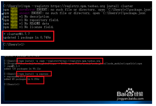 8、我们还需要做的最后一个工作是,将npm的模块下载仓库从默认的国外站点改为国内的站点,这样下载模块的速度才能比较快,只需要一个命令即可,命令是:npm --registry https://registry.npm.taobao.org install cluster上面的命令是临时使用国内一家npm源的地址来安装cluster模块。从下面图中可以看到,速度非常快。只用了不到0.8秒。而我们上面第一次安装的时候用了差不多3秒多,速度快了3倍多。如果想一直使用这个源的地址,那么可以使用下面这个命令来配置。npm install -g cnpm --registry=registry_urlregistry_url指的是国内提供的一些npm仓库地址,常用的有:https://registry.npm.taobao.orghttp://r.cnpmjs.org/这两个都可以使用。如下面第二张图所示,配置好国内源后,安装一个较大的模块express,只用了不到6秒多一点,速度提升还是非常可观的。至此,nodejs和npm在windows上的配置就全部完毕。