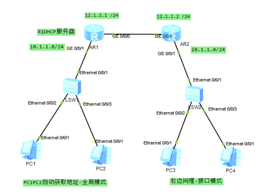 [R2-GigabitEthernet0/0/1]dhcp select interface 选择DHCP模式为接口模式