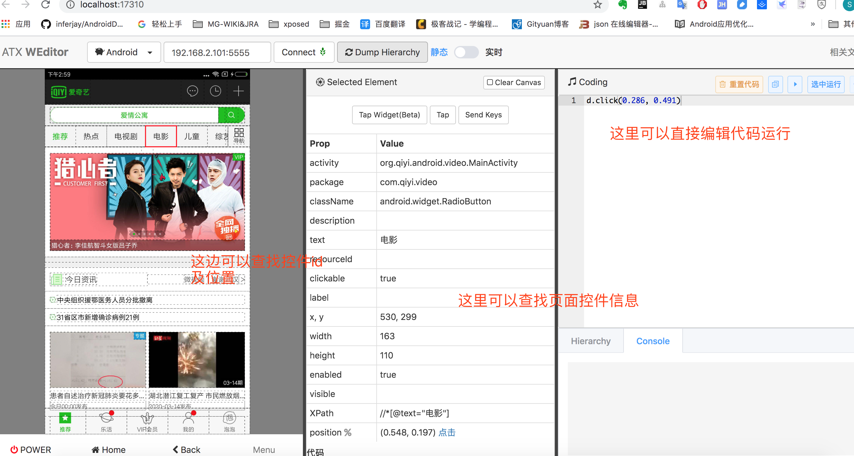 3、python3 -m weditor 启动浏览器,输入ip+端口即可 完成链接,效果如下