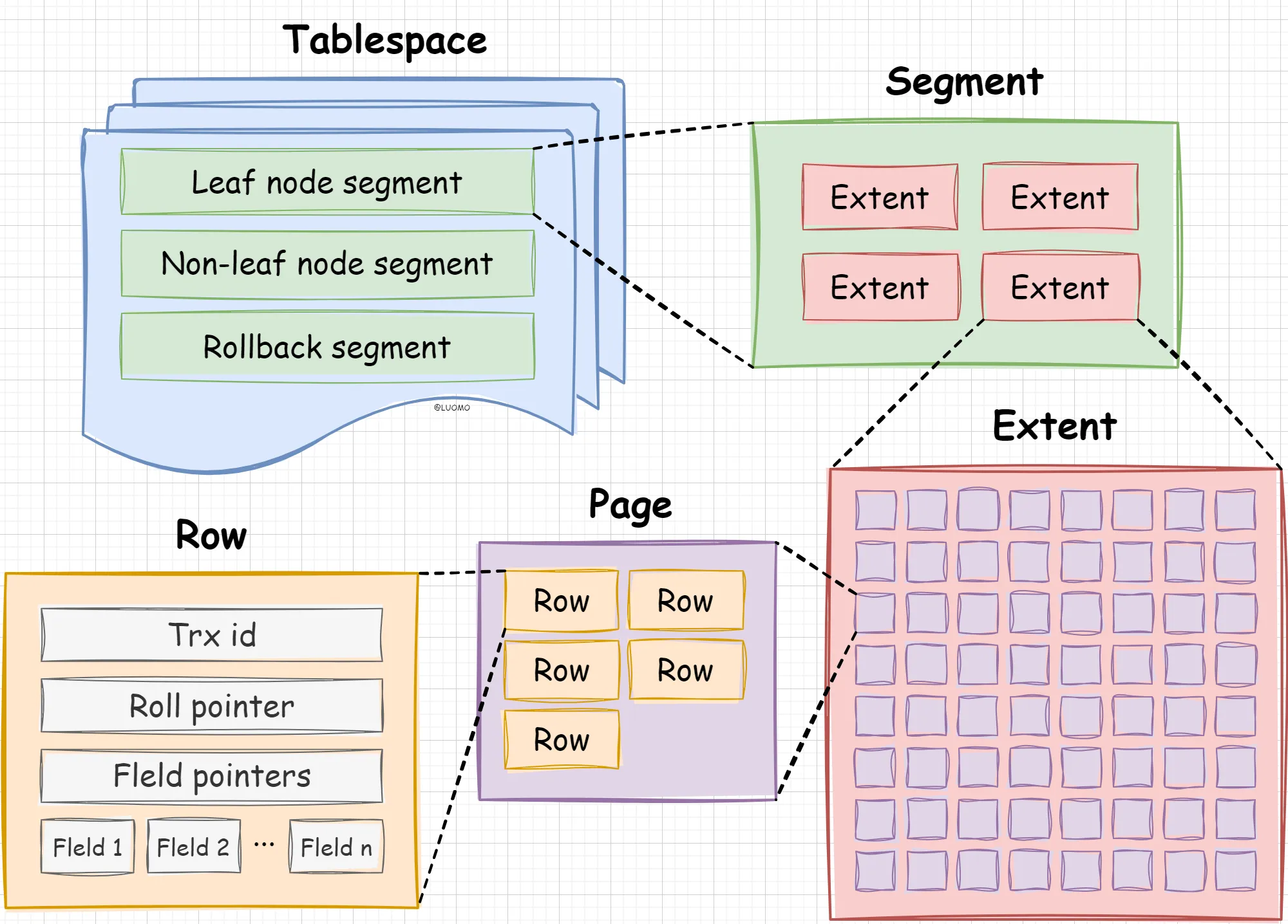 InnoDB中所有数据都被逻辑地存放在一个空间中,称之为表空间(tablespace)。表空间又由段(segment)、区(extent)、页(page)组成,页在一些文档中有时也称为块(block)。逻辑存储结构大致如下图: