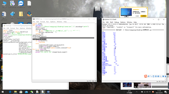 1.参考Python语言程序设计这本书上关于词云的内容并在Python的idle上输入代码如上
