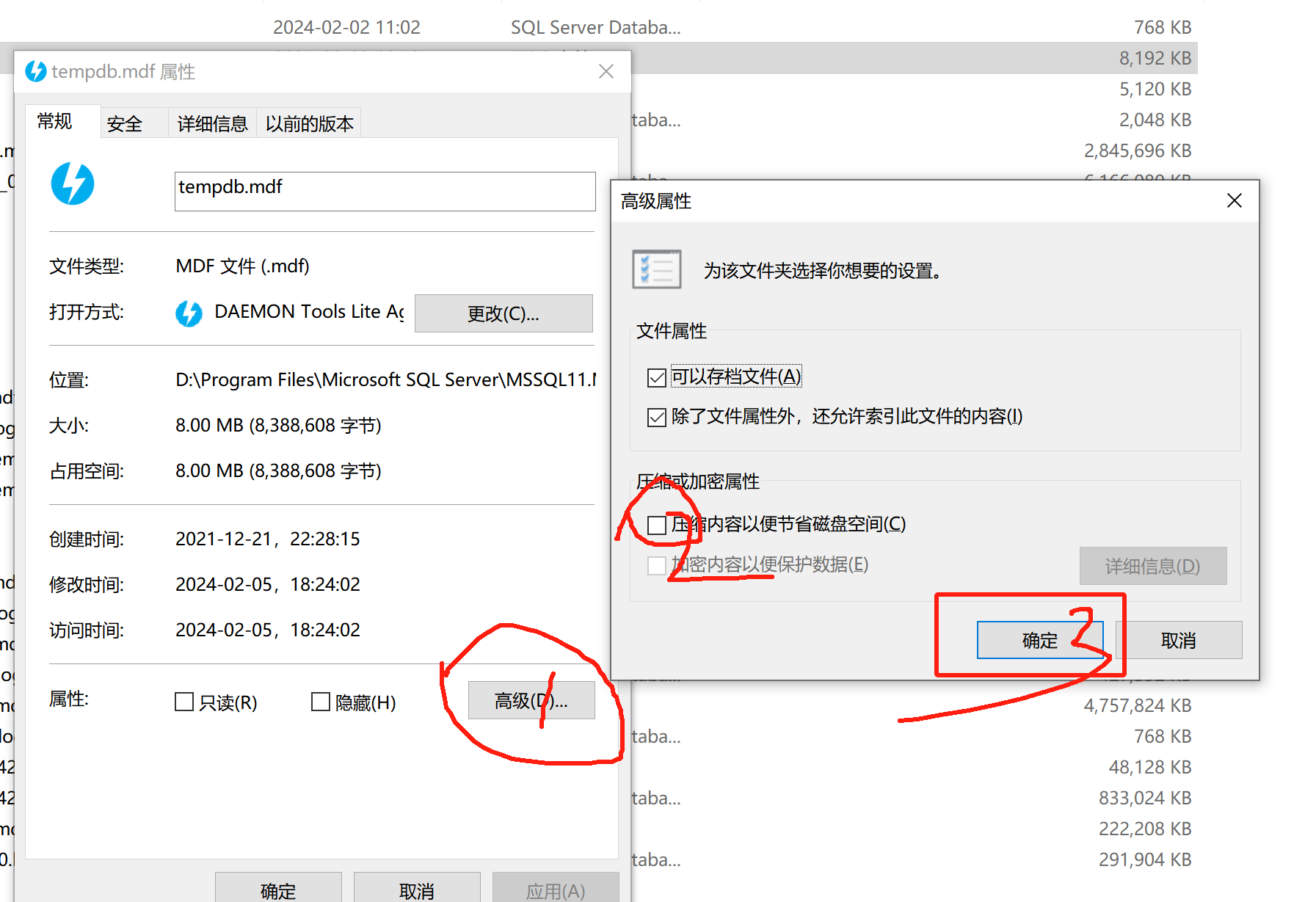 3、打开E:\tempdb,找到tempdb.mdf和 tempdb.ldf文件,右击属性,单击高级,勾掉【压缩内容以便节省磁盘空间】,单击确定;
